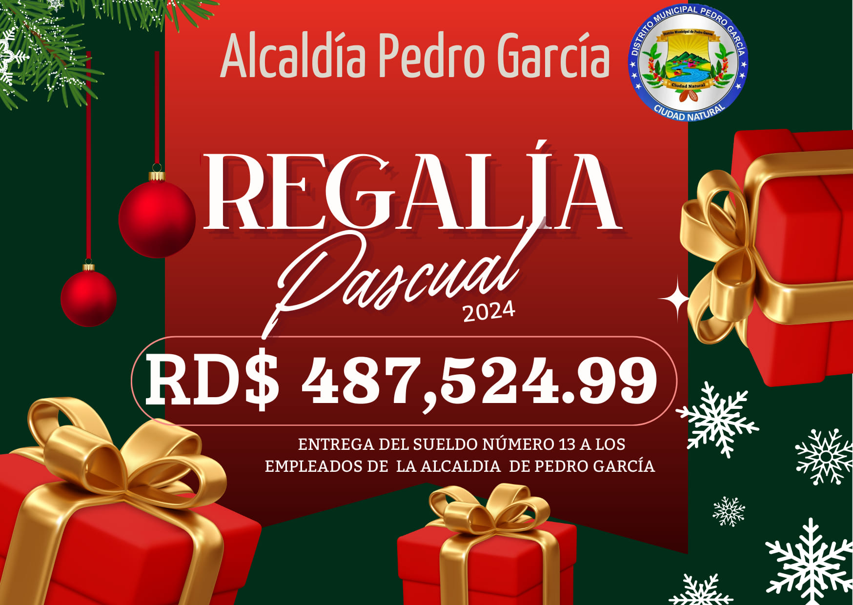 Alcaldía de Pedro García entrega regalía pascual (sueldo 13) a todos los empleados por un monto total de RD$487,524.99 [cuatrocientos ochenta y siete mil, quinientos veinticuatro pesos con noventa y nueve centavos]