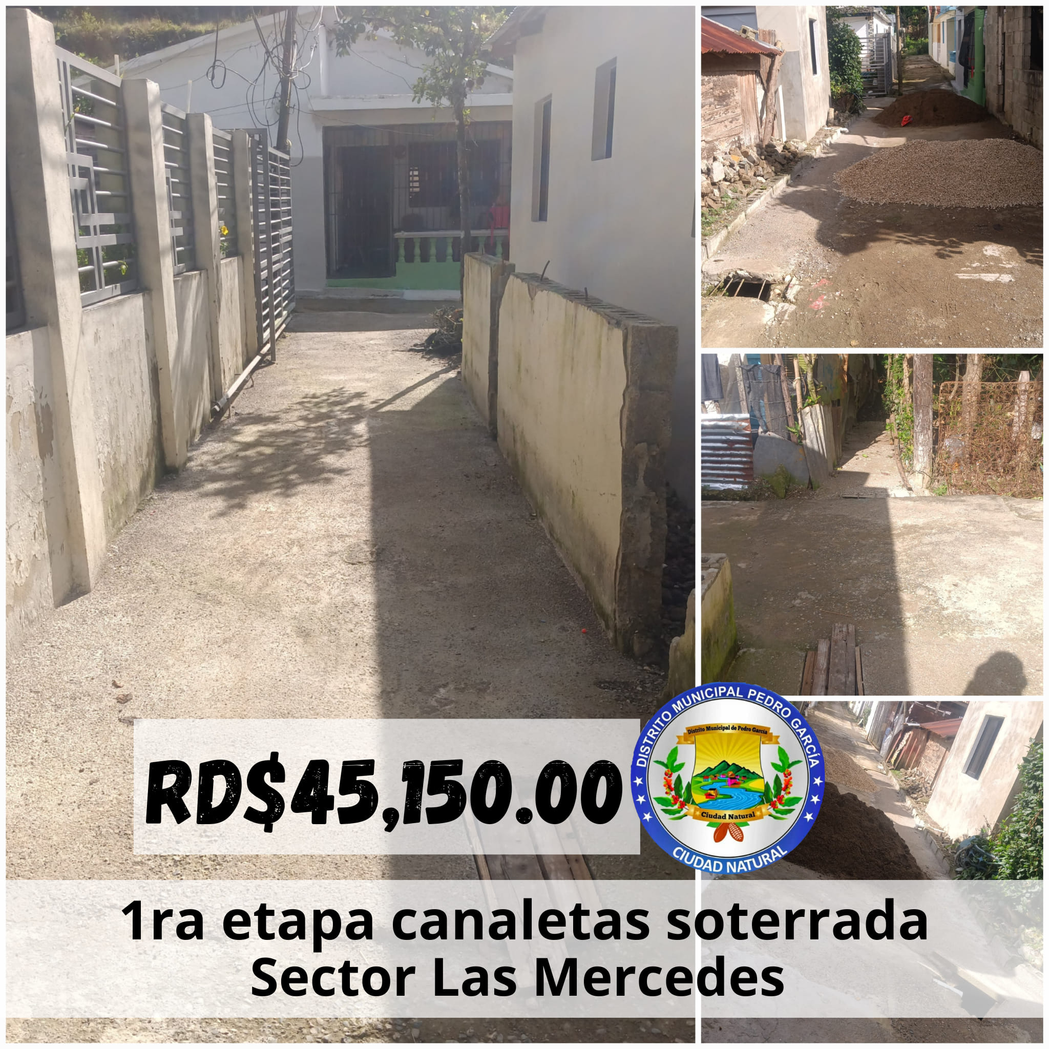 RD$45,150.00 pesos en la construcción de la primera etapa canaletas soterradas del sector Las Mercedes, una solución al desborde de aguas negras que se producía cuando se tapaban las canaletas o las fuertes lluvias.